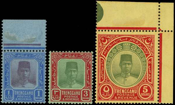 1921 $1. $3 and $5 watermark MCA, o.g., the $1 and $5 hinged on the selvedge, the stamps unmounted o.g. SG 23-5, £300