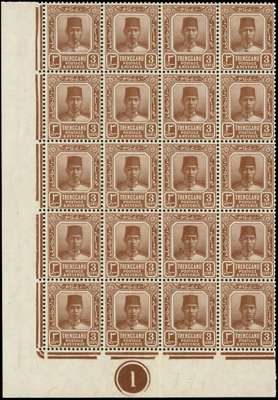 1938 3c reddish brown Plate block of twenty from the lower left of the sheet unmounted o.g. with the usual streaky gum, fresh for this, folded between second and third columns. SG 29, £960
