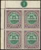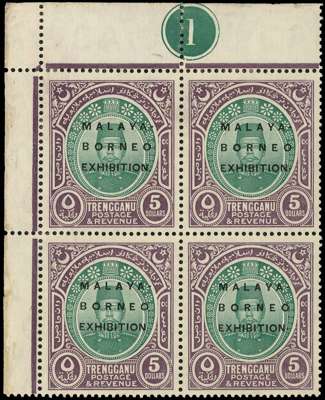 1922 $5 Malaya-Borneo Exhibition top left Plate block of four o.g., probably unmounted but with light pink interleaving adhesion on reverse, the right-hand stamps with raised stops. A rare multiple. SG 58, c, £1950
