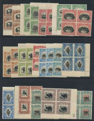 1909-23 set of thirteen in blocks of four (almost all sheet corners, many with sheet numbers), unmounted o.g. Eight extra blocks including 1c brown, 5c dark brown, 6c apple-green, 10c blue, 10c turquoise-blue and 12c deep blue. Some gum wrinkles but a remarkable assembly. Also 1909 20c on 18c block unmounted o.g. SG 158-177, £3000+