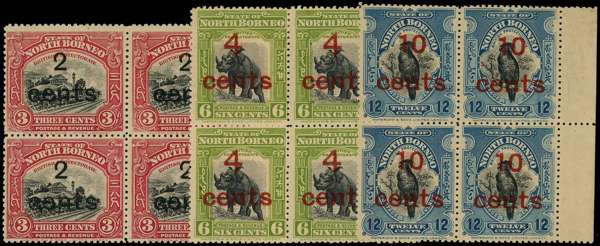 1916 surcharge trio in right-marginal blocks of four, o.g., the upper pair in each hinged with the lower pairs unmounted. The lower right stamp in each block with the R2/5 inverted 'S' variety; fine. SG 186, a - 188, a, £824