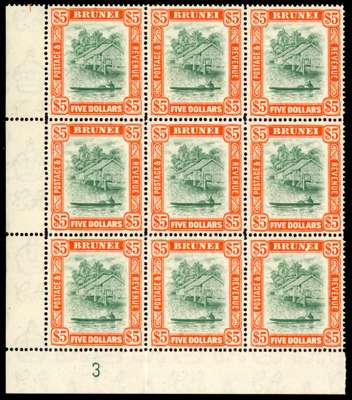 1948 $5 green and red-orange and $10 black and purple, lower left corner blocks of nine each with Vignette Plate 3, unmounted o.g., evenly toned gum. SG 91-2, £1134