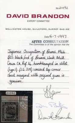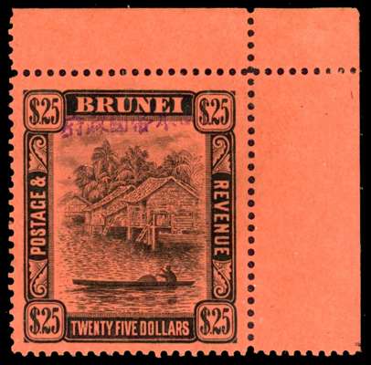1944 $25 black on red paper top right corner example, fine with the usual dried o.g. Brandon Certificate (1997). SG J19, £1000