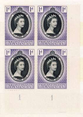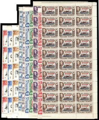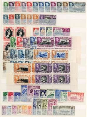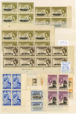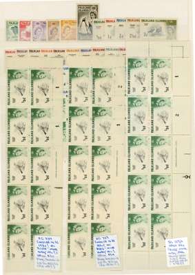 1938-54 mint group with KG VI issues in toned singles; some blocks including 2/6d to £1, 1937 printings, some staining but with some good singles possible; 1962 ½d DLR imprint and Plate block with weak entry unmounted, 1d and 2d DLR Plate blocks;; 1954 Dependencies DLR blocks but lightly toned. Also sheets with Falklands 1946 Victory, 1960 1d, 2d and 2½d, and a few Dependency overprints including 6d South Shetlands; toning