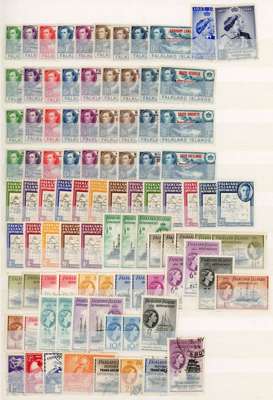 1944-54 mint balance collection (with a few used). Includes overprint sets in blocks (toned); Thick Maps sets of Plate blocks (three, some with ‘enlarged South Georgia’ including an extra 6d ochre block), toning; Thin Maps lower left corner blocks of four and Plate blocks of six, giving five sets with dot on ‘T’; most values in imprint blocks of eight; ½d sheet, Victory sheets, and selection of singles including some used. Generally with some toning, some 2ds oxidised