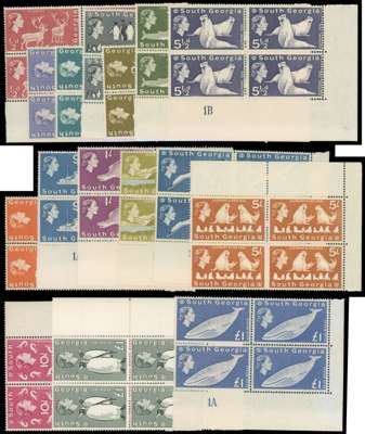 1963-9 set of sixteen in blocks of four, unmounted o.g., mostly Plate or imprint blocks. Some light gum toning. SG 1-16, £800