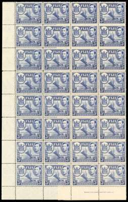 1945 3d blue lower eight rows of sheet, R4/2 spur on medallion, unmounted o.g. R5/2 with a toned spot on reverse; folded and a bit fragile, cream gum. SG 257a, £750