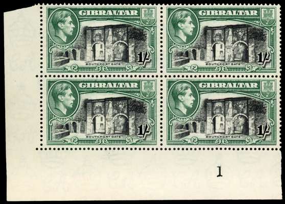 1938-42 1/- perf 13½ lower left corner block of four with Vignette Plate 1, unmounted o.g, fine. SG 127a, £300