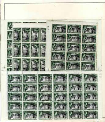 1942-51 1/- perf 13 four sheets (one in two halves), o.g. Three from FP1: one from April 42 printing, prior to re-entering; one tentatively identified as 1947 printing, with re-entries; another with re-entries, and one with FP2 (splitting and reinforced). Unusual. SG 127b, £1560