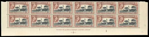 1951 printing of the 2/- bottom two rows of the sheet with R9/3 bird on memorial and 9/4 broken ‘R’ unmounted o.g., cream gum with some light bends, a rare multiple. SG 128ba, bb, £3900