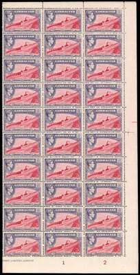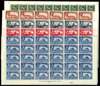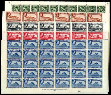 1938-51 ½d - 6d sheets, a substantial accumulation. 13 double-pane sheets of the ½d; 1d x 3 (SG 122b, c and d); 2d grey x 9; 2d carmine x 7; 3d x 4 and 6d. Various plate numbers, excellent study material with notable plate scratches on some of the 2d sheets. Some splitting, reinforcement and some foxing/toning, but including fine. SG 121/126b