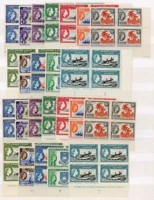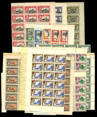 1937-1962 multiples collection, unmounted o.g. 1939 set in corner blocks of four, all Plate blocks save ½d, each with contemporary printing dates on selvedge, a few a little toned; various imprint blocks to 1/-; sheets and large blocks including 1938 5d sheet. 1956 set in Plate blocks of four and imprint blocks of four some with light toning; imprint blocks of six to 2/6d, and a few other multiples. An attractive and useful group, viewing recommended