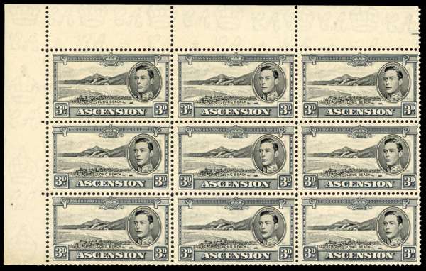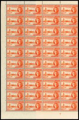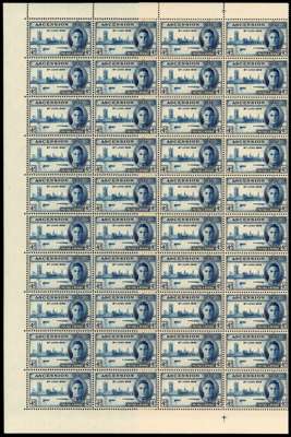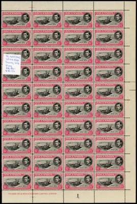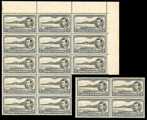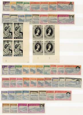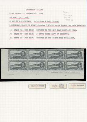 1937-53 KG VI small balance lot with the original twelve values in unmounted o.g. lower right corner blocks of four, all with toned gum. Also toned sets of singles; ½d block with torpedo flaw and a single with the same flaw, each unmounted; 3d block with R10/2 and 10/4 sky retouches, and 10/3 extra rocks plus various other multiples