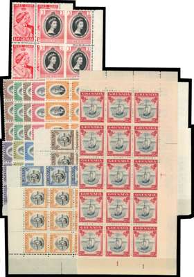 1938-51 collection on stocksheets, mint. The 1938 set with all perfs and shades less 157a, 163a and b, with SG 163c having brownish gum, otherwise fine, mostly hinged; the rest unmounted with various Plate blocks including 2/- x 2, 10/- carmine-lake SG 163d but with gum toned to varying degrees; SG 163e Plate and imprint block of ten (splitting into blocks of four and six), 163e another imprint block of eight, and 163e Plate block, varied gum; 3d line on sail and colon flaw blocks, lightly toned. 1951 set in corner blocks of fifteen. Also a few sheets and larger multiples with 2/- perf 12½ sheet, R1/1 partial state (quite toned); 5/- perf 13½ x 12½ bottom two rows. An interesting collection