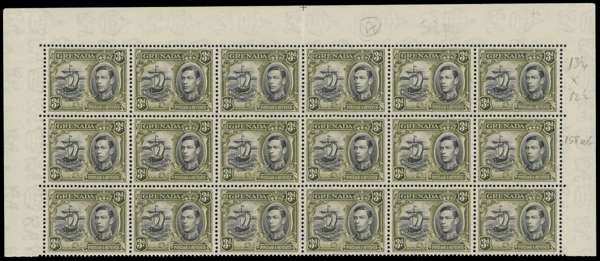 1942-50 3d perf 13½ x 12½ top three rows of sheet with R1/6 extra window and broken handrail, unmounted o.g., fine. SG 158ad, £275