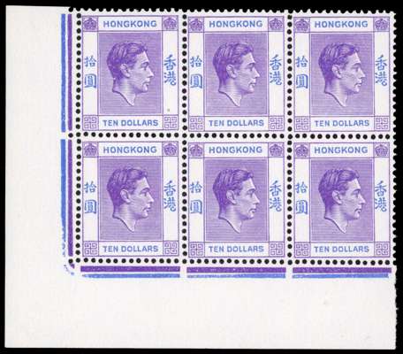 1946 $10 pale bright lilac and blue lower left corner block of six, unmounted o.g., R9/3 LP tiny break in ‘N’ (Halewood & Antscherl 161). SG 162, £840