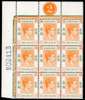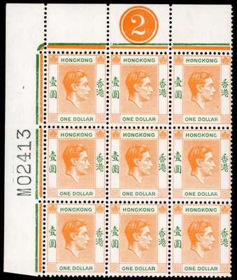 1948-52 $1 red-orange and green on chalky paper, Requisition M block from the top left corner of the left pane, unmounted o.g. Includes R3/1 short leg to ‘R’ and the large varieties on R1/3 (sliced ‘R’) and 2/3 (badly broken ‘G’ and ‘R’). A fine multiple. SG 156b, ba, £890