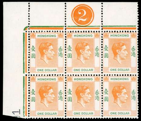 1952 $1 yellow-orange and green on chalk-surfaced paper, unmounted o.g. Plate 2 block of six. R3/1 short leg to ‘R’, also R1/3 sliced ‘R’ and 2/3 badly-broken ‘G’ and ‘R’. SG 156c, ca, £1200