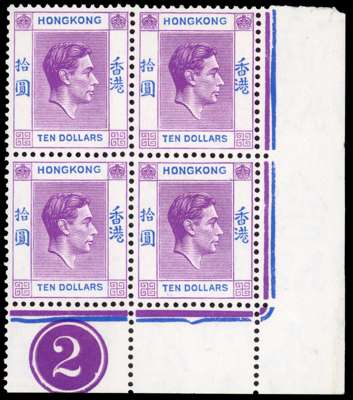 1947-52 $10 reddish violet and blue on chalky paper Plate 2 block of four from the right pane, lightly hinged on the selvedge, the stamps fine unmounted o.g. SG 162b