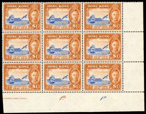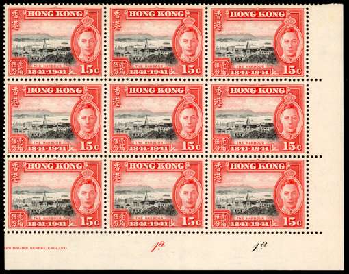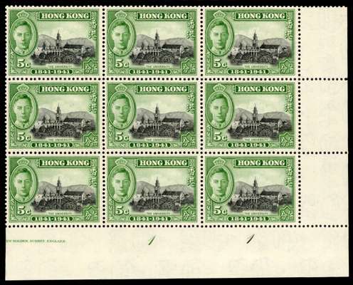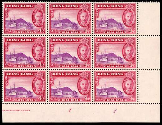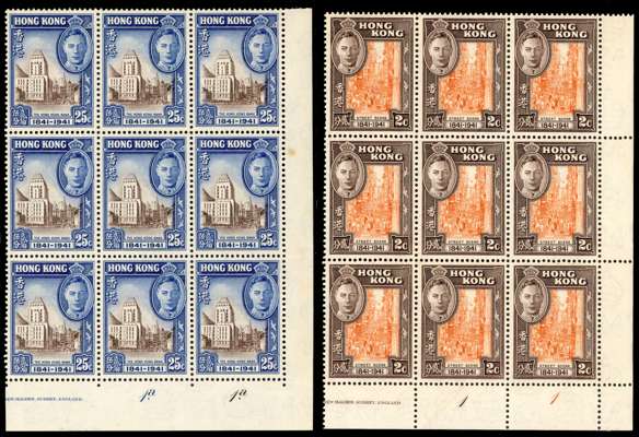 1941 Centenary set of six in Plate blocks of nine, with part imprint unmounted o.g. Overall light toning. Small foxed spot on one 2c, and another on the selvedge of the 25c, otherwise fine and of very good appearance.. SG 163-8, £810