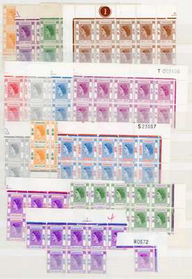 1954-62 set of fourteen in unmounted o.g. blocks. All blocks of ten save for the $10, which is in an irregular block of eight of the basic stamp plus a corner single of the light shade, with Requisition W. The 5c and 15c blocks are toned; the 15c slightly so; the 20c, $1 and $5 are Plate blocks (the $1 with R10/9 short ‘R’, the $5 with minor gum disturbance affecting four stamps); the 25c to 65c, $1.30 and $2 are Requisition blocks. An unusual group. SG 178-191, £2585