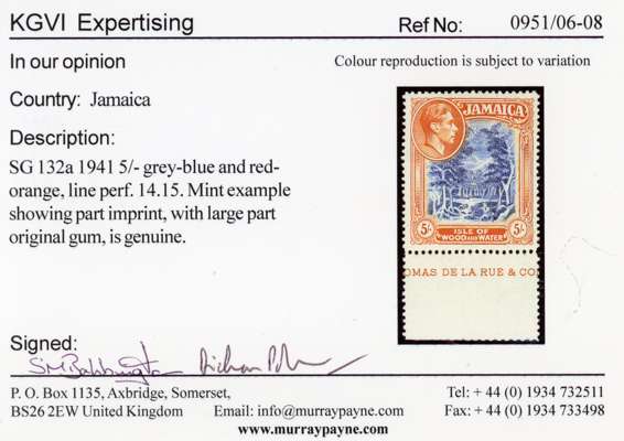 1941 5/- grey-blue and red-orange, line perf 14, large part o.g. which is a little toned, with part imprint. KG VI Expertising Certificate (2008). SG 132a, £7000