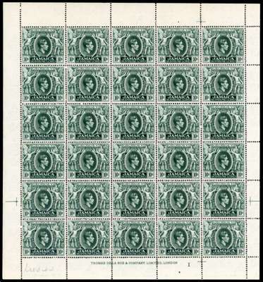 1938-50 10/- myrtle-green perf 14 complete sheet of thirty, unmounted o.g. R2/4 scratch down left angel and R6/4 scratch right of right value tablet. SG 133, £330
