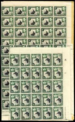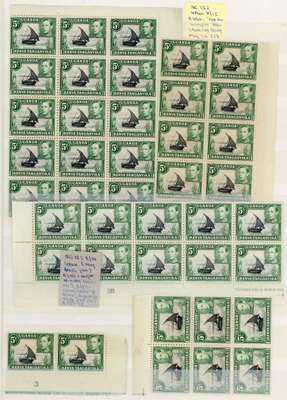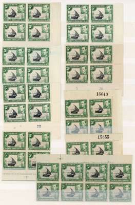 1938-49 5c black and green multiples, mostly unmounted o.g. Plate pairs; CP1A, FP2, 3 (two, one with lathework), 5-2b. Blocks of four; CP 1B (two, one with lathework, both poor), another two 1B blocks (one with lathework) both with R10/1 major re-entry; 1A; FP 2 (very toned), 3 (three), 5, 5-2A, 5-2B. Other multiples with Berrington-listed varieties including R4/10 rat on bowsprit, 9/7 ‘comma’ before A DHOW, sheets; CP 2 (very toned), 5-2B (2). Excellent study material, but generally with some gum toning. SG 132