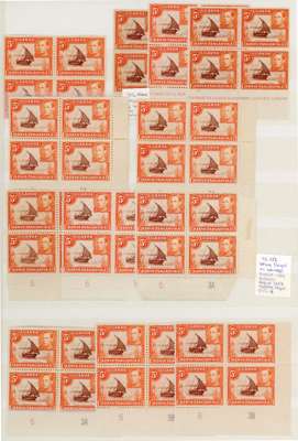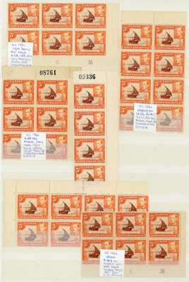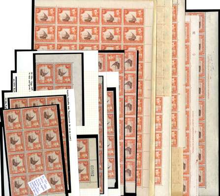 1949-50 5c orange (both perfs) range of multiples (several hundred stamps) mostly from Plates 6-3A and -3B (two complete sheets of 3B), but also 5-3A, mainly unmounted o.g. with some light toning. A good number with Berrington-listed varieties. A splendid group for the specialist. SG 133, a