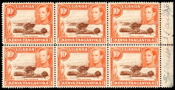1941 10c red-brown and orange perf 14 marginal block of six, o.g., the middle pair unmounted, the left pair with a bend. Unusually well centred. SG 134c, £780