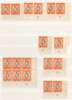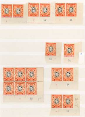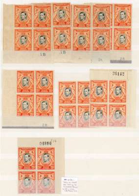 1938 20c black and orange perf 13¼ three lower right corner pairs; FP2 CP-, 3-3A and 3-3B (latter thinned), lightly toned o.g. with some hinge remainder on selvedge; Plate blocks of four (all lower left with CP numbers) 1B (2), 2A (two, one partially printed) and 2B (2, both with lathework). Perf 14 corner singles with CP 3A and 3B; pairs with 2-3A (left stamp creased) and 2-3B; 2-3B block of six. Also two further perf 13¼ blocks, one with sheet number, and perf 14 block with sheet number (minor varieties). All stamps with variably toned gum, mostly quite severe, but unmounted. Difficult group. SG 139, a