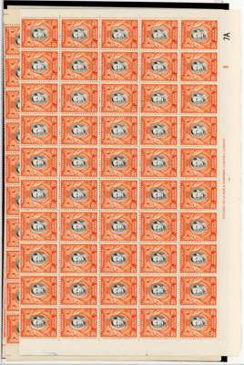1942-51 20c perf 13¼ x 13¾ black and orange unmounted o.g. multiples. Imprint block of 11, Plate 4-5B block of nine; Plate 3-3B bottom 6 rows with R7/3 'mole on lip'; Plate 5-5B bottom 5 rows, and 8-7A sheet with R9/2 ‘stray hair on temple’. Light to moderate gum toning. SG 139b, £2530