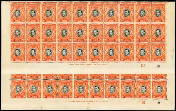 1951 20c deep black and deep orange multiples, unmounted o.g. Plate 10B-8A sheet of 100, some splitting and gum toning; 10A-8B bottom three rows, very fine with just a faint hint of gum toning. SG 139ba, £3640