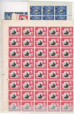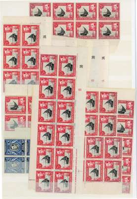 1952 25c and 40c multiples mint, nearly all unmounted. 25c six Plate blocks; blocks of 79, 30, 50 and 12 (both 1B-3B), imprint block of eight and three multiples (40, 16 and 8) each with the good R5/1 ‘crescent under stern’ variety. 40c three Plate blocks; imprint blocks of 30, 20, 8 (2) and 70 each with small part double impression of imprint (see Berrington), the latter with the R6/7 weak entry at lower left, and a sheet number block of thirty. Some gum toning. SG 140, 143