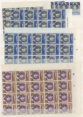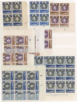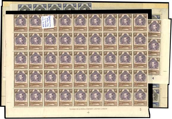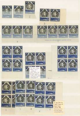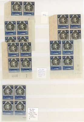 1938-52 30c multiples mint, mostly unmounted. Perf 13¼ block of four, two corner blocks with both Plate no. 1s under R10/2 and pair with CP1 only, and a further block from lower right corner without number; perf 14 part imprint block of four; perf 13¼ x 13¾ small range including Plate blocks, complete sheet (Plate 5-4) and other good multiples. The interesting 30c purple and brown with multiple blocks (for varieties, see Berrington), with an emphasis on the R10/1 retouch on hill. SG 141-2