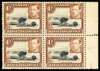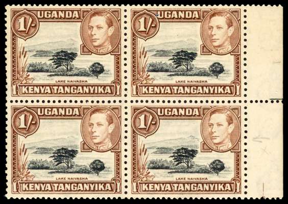 1942-9 1/- black and brown perf 13 x 11¾ positional block of four showing R5/10 mountain retouch, brownish gum, hinged on R4/10 only with the rest unmounted o.g. SG 145ad, £4500