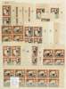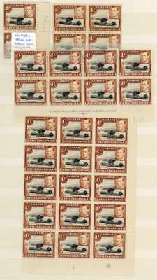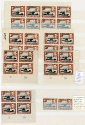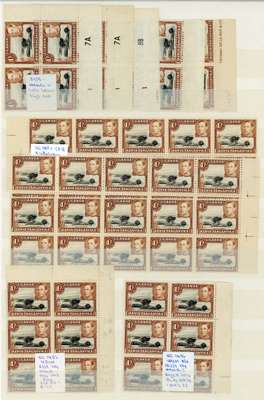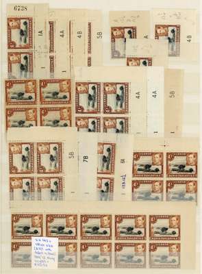 1938-50 1/- multiples (170 stamps in all). 1938 yellowish brown FP 1 block but toned, then a good range of black and brown perf 13 x 11¾ Plate pairs and blocks, other multiples some with plate varieties. Perf 13 x 12½ Plate 1-8A block of fifteen, imprint block of eight and other multiples; the 1950 clear impression with Plate 2B-10B, 3B-10B and 3B-11B and other multiples. Variable gum toning, nonetheless an impressive collection. SG 145-ba