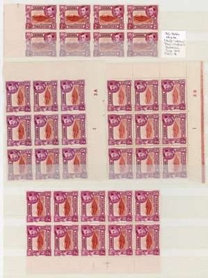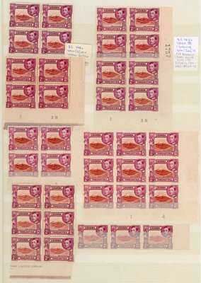 1941 2/- perf 14 lower marginal block of four with lathework, mint with three unmounted. The remainder perf 13¾ x 13¼; Plate 1-3A blocks of four and nine, 1-3B two blocks of four and block of nine (two with lathework), Plate 1-4 blocks of four and nine, strip of five and blocks of six, eight and ten. Minor varieties; variable gum toning. SG 148a, b, £3940