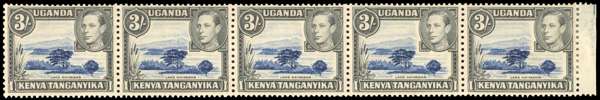 1947 3/- deep violet-blue and black positional strip of five with R6/7 damage on mountain. O.g. (lightly toned gum), hinged on left stamp and with reinforcement between the right stamp and selvedge; a rare piece, with BPA Certificate (1997). SG 147ab, £7500