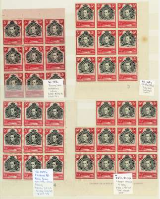 1941 5/- perf 14 block of nine; perf 13¼ x 13¾ irregular imprint block of eleven, Centre Plate 3 and Plate 4 blocks of nine. all unmounted o.g. with toned gum. The Plate 3 block with a foxed area on the selvedge, otherwise good appearance. SG 148a, b, £2135