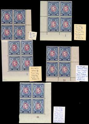 1941-52 10/- perf 14 and perf 13¼ x 13¾ blocks of four, o.g., unmounted unless stated. Perf 14 marginal gum toning; fine lower left corner block with FP1 and lower right corner block with CP3B with lightly toned gum, hinged on top pair. Perf 13¼ x 13¾ lower left corner FP1 Plate block of four, fine shade, dated ‘7/52’ on selvedge, and lower right corner block of four with CP4. Nice group. SG 149a, b