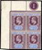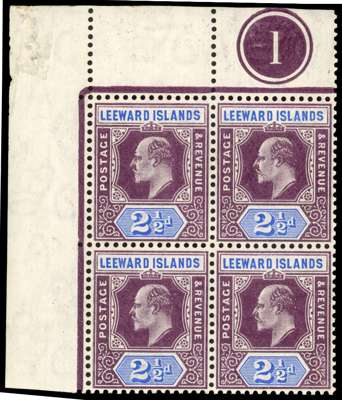 1905 2½d dull purple and ultramarine, watermark MCA. Top left corner block of four with Plate 1, hinged on selvedge only, with minor abrasion and crease affecting the corner of the selvedge. Hinged on the selvedge only with the stamps unmounted; trifling offset on one stamp, a very scarce multiple. SG 32
