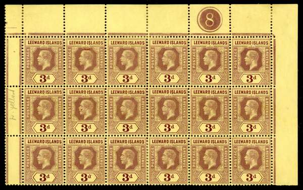 1912-22 3d purple on buff paper top three rows of right pane with Plate no. 8, centrally separating and partially reinforced; a little foxing on reverse of selvedge and just touching R1/6. O.g., with at least ten stamps unmounted. SG 51c