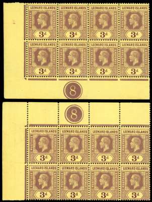 1912-22 3d purple on buff paper two Plate 8 blocks of eight from the top and bottom left corners of the left pane, each o.g., hinged on the selvedge only. SG 51c