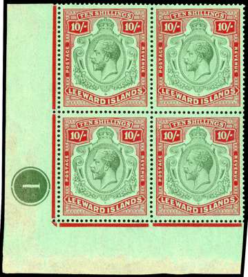 1921-32 10/- green and red on green paper lower left corner block of four with Plate 1, o.g., lightly hinged on the top pair only; some gum bubbles and crazing, showing incomplete calendering on the selvedge; a little splitting between the side selvedge and stamps. SG 79