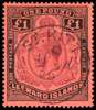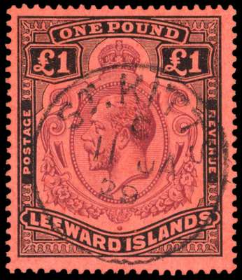 1928 £1 purple and black on red paper, fine used with St Kitts CDS of 11 JA 29. Neat and attractive. SG 80, £425