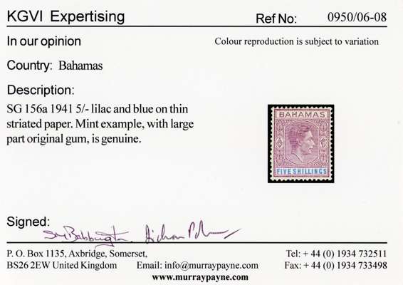 1941 5/- lilac and blue on thin striated paper, large part creamy o.g. Ex Moreton Black, KG VI Expertising Certificate (2008). SG 156a, £5500