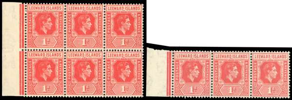 1947 1d scarlet marginal block of six, top right stamp with R7/3 LP DI flaw, and 1938 1d red marginal strip of three with the same variety. fine unmounted o.g. SG 99a, ca, £430