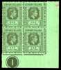 1938 1/- black on emerald paper Plate 1 block of four, R9/6 RP ‘DI’ flaw and 10/6 damaged value tablet, small arricator remnant on selvedge and light hingemark on R9/5 otherwise unmounted o.g., with the usual streaky brown gum. SG 110a, £600