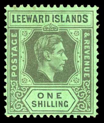 1938 1/- black on emerald paper, R9/6 RP ‘DI’ flaw, unmounted o.g. with good gum for this. SG 110a, £600